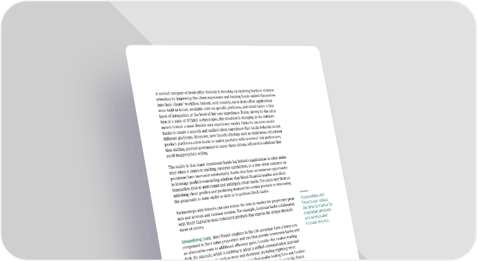 A second category of front-office fintechs is focusing on enabling banks to increase retention by improving the client experience and helping banks embed themselves into their clients’ workflow. Indeed, until recently, most front-office applications were built in-house, available only on specific platforms, and siloed under a thin layer of integration at the level of the user experience. Today, driven by the adop- tion of a suite of HTML5 technologies, this situation is changing as the industry moves toward a more flexible user experience model. Fintechs can now enable banks to create a smooth and unified client experience that tracks behavior across different platforms. Moreover, new fintech offerings such as multi-issuer structured product platforms allow banks to match products with investors’ risk preferences, thus shifting product governance to more client-driven, self-service solutions that avoid inappropriate selling. The reality is that many investment banks lag behind organizations in other indus- tries when it comes to tracking customer satisfaction, at a time when customer ex- pectations have increased substantially. Banks thus have an immense opportunity to leverage predictive-modeling solutions that blend financial-market and client transaction data to understand and anticipate client needs. Use cases vary from es- tablishing client profiles and predicting demand for certain products to forecasting the propensity to issue equity or debt or to perform block trades. Partnerships with fintechs can also reduce the time to market for proprietary prod- Partnerships with ucts and services and increase revenue. For example, Goldman Sachs collaborated fintechs can reduce with Motif Capital to issue structured products that express the unique thematic the time to market for views of clients. proprietary products and services and Streamlining Costs. Most fintech enablers in the CM ecosystem have a lower-cost increase revenue. component in their value proposition and can thus provide investment banks with an alternative route to additional efficiency gains. Consider the modern trading desk, for example, which is evolving to adopt a unified communication approach that merges channels, such as voice and electronic (including digitizing voice trading through speech recognition). Services that enable trading from any location, while leveraging cloud-computing services, could become ubiquitous in the future. Such software could eliminate large portions of legacy systems and costly private- communication lines, as well as improve overall asset productivity. By moving to internet-based cloud-computing services, investment banks can rent computing power and hardware in a way that efficiently meets fluctuating demand. In addition, mutualizing costs in post-trade and support is a particularly attractive opportunity, the benefits of which have yet to be fully realized. Current utility play- ers are still nascent, and adoption is slow because the market remains fragmented. Meanwhile, process automation is expected to maintain momentum across both front- and back-office activities as machines continue to replace human workers. Some of the most promising areas are intelligent processing, which can be found in functions as varied as robotics and machine learning systems, and the application of distributed ledger technology for settlement, confirmation, and reconciliations. Other potential areas to realize cost efficiencies include connectivity and order management systems in fixed-income and trader communications. The Boston Consulting Group 11