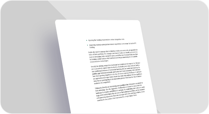 • Opening the banking framework to reduce integration costs • Improving strategic principal-investment capabilities to overcome the lack of VC funding Banks also need to manage their technology stacks as investors do and quantify the value of their portfolios. For example, investment banks can identify potential ven- tures by leveraging their current IT assets, much the way Goldman Sachs has done by forming a joint venture with Synchronoss to begin monetizing its IP in mobile communication technologies. Overall, the shifting competitive landscape has heightened the urgency for CM play- ers to proactively explore fintech adoption. Nonbank players have already broken into traditional fortresses of investment banking, such as market provisioning. Ca- pability gaps between nonbanks and banks have been decreasing, while investors have been growing impatient in the face of chronic underperformance. A wait-and- see approach is no longer viable. Banks that defer their options will lose significant value by not participating in the innovation process. They face the risk of disinter- mediation by competitors. Ultimately, fintechs are introducing new paradigms that CM players can exploit to their advantage. (See the Appendix.) Proliferation in innovation means that the landscape is complex and difficult to navigate. By establishing labs to focus on early- stage, novel technologies that are core to their principal activities, and by systemati- cally pursuing adjacencies that have synergies with their existing portfolios, invest- ment banks can position their businesses for a bright digital future. 16 Fintech in Capital Markets